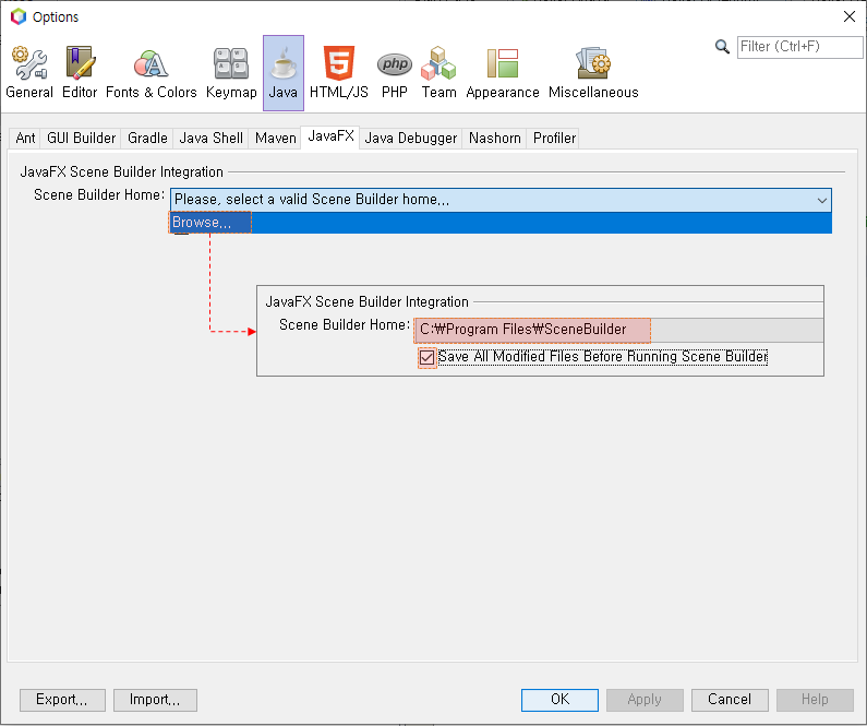 의 값을 Scene Builder 설치 경로를 선택하면 됩니다.