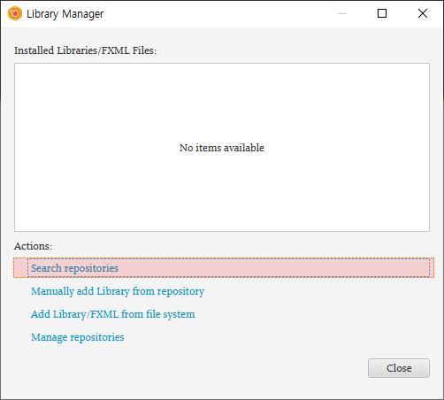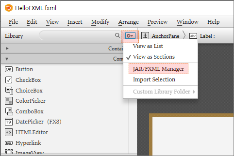 Library 검색어 옆에 설정 아이콘을 클릭하면 메뉴가 나오는데 거기서 JAR/FXML Manager를 클릭합니다.