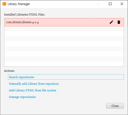 간략하게 추가하는 라이브러리에 대해 설명하자면, JFoeniX 라이브러리는 Scene Builder에서 제공하는 기본 컴포넌트 보다 좀더 화려하고 미려한 컴포넌트를 제공하며, FontAwesomeFX는 웹 아이콘 지원을 추가하는 오픈 소스 라이브러리입니다.