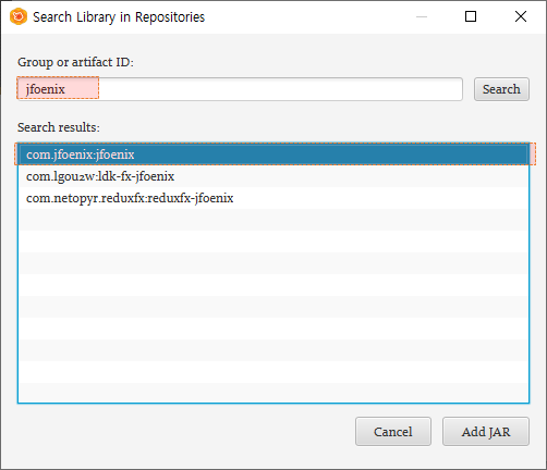 Group or artifact ID 입력란에 jfoenix를 입력 후, Search를 클릭합니다. 그러면 검색된 목록 중에서 com.jfoenix:jfoenix를 클릭 후, Add JAR를 클릭합니다.